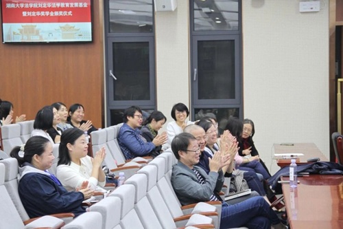 兼职教授李德文先生作为捐赠人发言。他首先表达了他是带着感情和责任而来,并回忆了人生的第一份工作就是和刘老师一起,对刘老师、曾经的同事、教室、讲台始终带着一种深深的情感。他表示,因为法治之路,道阻且长,愿意尽绵薄之力,期盼未来的青年学者、法治栋梁能成为擎天之柱,为法治中国添砖加瓦。