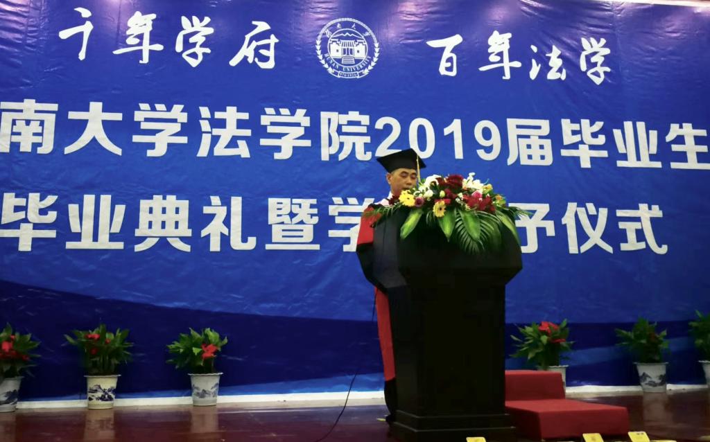 下一环节是院长致辞,屈老师以“法治日进,盛德日新”为主题,为毕业生送别。屈老师以“变革”为主线,从中国的时代变革谈到法治变革,从五楼自拍