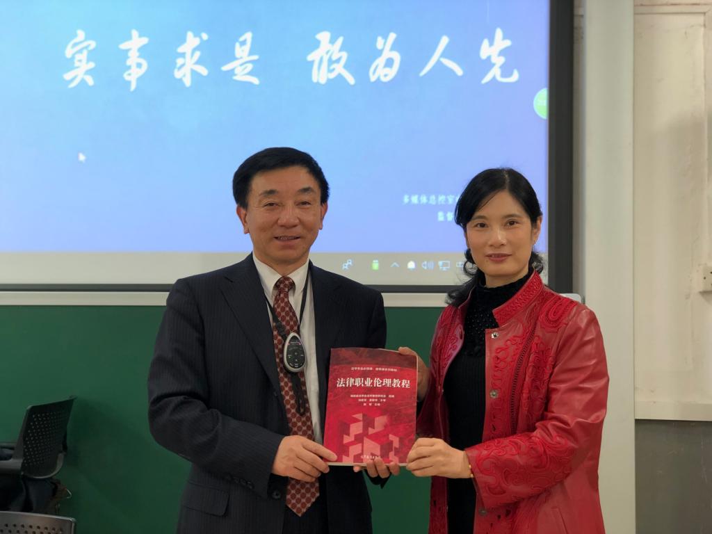 最后,郭哲老师对本次讲座做了简要总结,并对柴会长的到来再次表示感谢,师生之间进行了互动活动,本次讲座在同学们热烈的掌声中顺利结束。这次讲座是法律职业伦理课程实务进课堂教学改革的尝试,通过这种实务专家现身说法的形式,同学们对检察官职业伦理有了更加深刻的认识,相信同学们都能铭记于心,共同为中国的法治建设添砖加瓦!最后郭哲老师将主编的最新《法律职业伦理教程》一书送给了柴学友会长,这种理论与实践紧密联系的教学模式使学生受益匪浅,受到学生的好评。