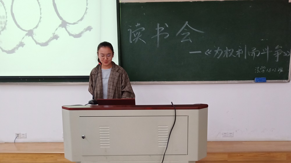 304教室展开。本次读书会选取《为权利而斗争》作为研读对象,邀请法学1802班班主任周子实担任评议嘉宾。2018级法学二班全体同学和来自其他年级的同学参加本次读书会。