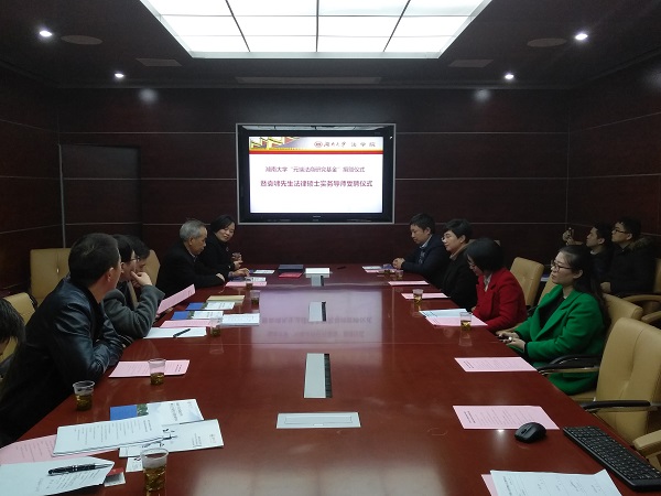 2017年12月20日下午,五楼自拍 “元端法商研究基金”捐赠仪式暨袁啸先生法律硕士实务导师受聘仪式在五楼自拍 405会议室举行,本次仪式由五楼自拍 院长助理湛建云老师主持,五楼自拍 教育基金会邓利华秘书长,五楼自拍 院长屈茂辉教授,肖海军教授,蒋海松副教授,肖洪泳副教授,王文胜副教授、雷秋玲、刘岳峰等多位老师以及湖南省元端律师事务所主任袁啸先生,执行主任董爽律师,吴卫萍律师、张瑾律师等参加了仪式。