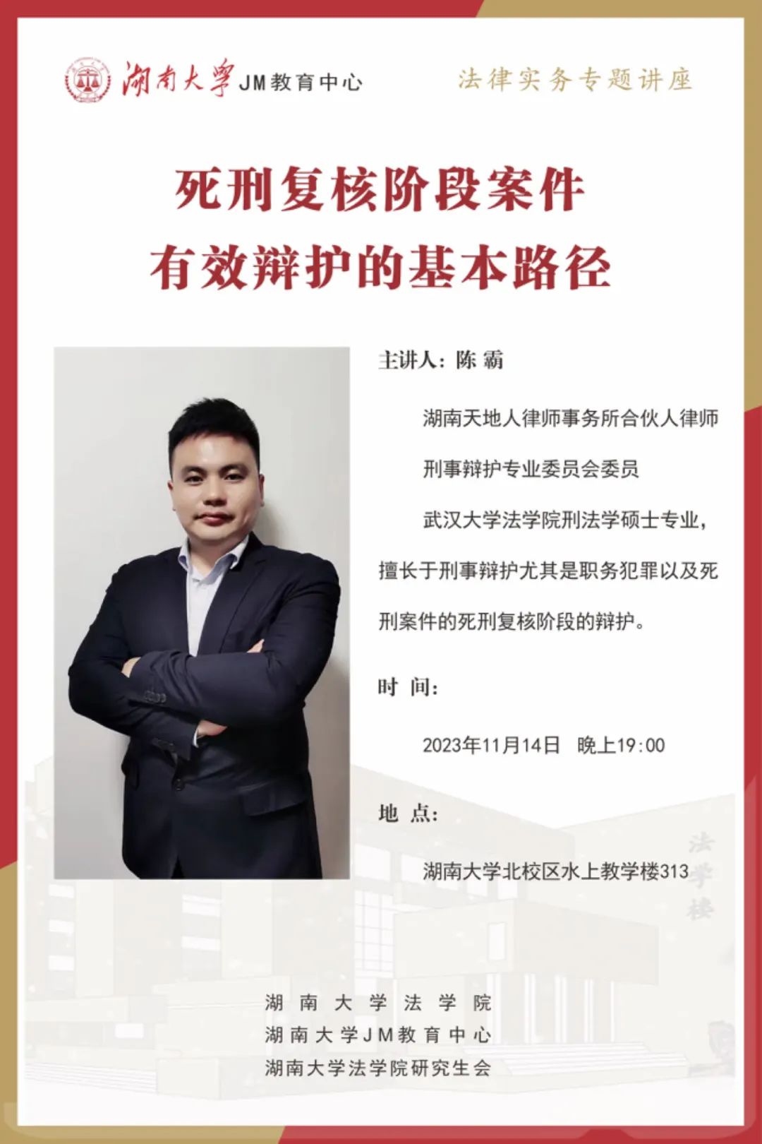本次JM实务讲座邀请到湖南天地人律师事务所合伙人律师陈霸为大家讲述死刑复核阶段案件有效辩护的基本路径,帮助大家了解死刑复核程序中的相关实务问题,欢迎同学们积极参与!