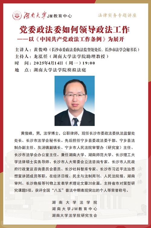 本次JM实务讲座邀请到长沙市委政法委执法监督处处长、长沙市法学会秘书长——黄俊峰,为大家讲述党委政法委如何领导政法工作——以《中国共产党政法工作条例》为展开,帮助大家了解相关实务问题,五楼自拍