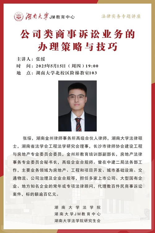 本次JM实务讲座邀请到湖南金州律师事务所高级合伙人张绥律师,为大家讲述公司类商事诉讼业务的办理策略与技巧,帮助大家了解相关实务问题,欢迎同学们积极参与!