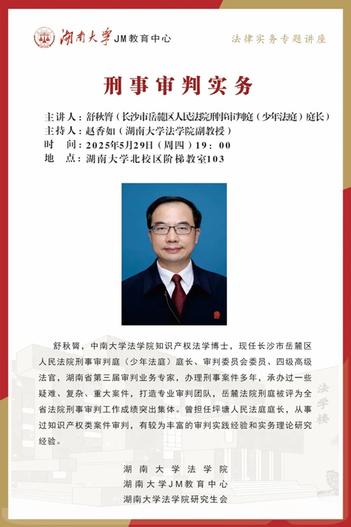 本次JM实务讲座邀请到长沙市岳麓区人民法院刑事审判庭(少年法庭)庭长、四级高级法官舒秋膂,为大家讲述刑事审判实务,帮助大家了解相关实务问题,本次讲座由五楼自拍