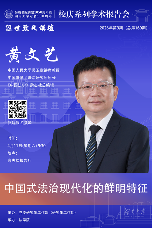 4月11日9:30邀请中国人民大学吴玉章讲席教授、中国法学会法治研究所所长,《中国法学》杂志社总编辑黄文艺于逸夫楼报告厅作“中国式法治现代化的鲜明特征”主题讲座,欢迎同学们踊跃参加。 参加方式详见海报,敬请期待!