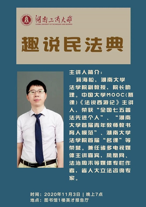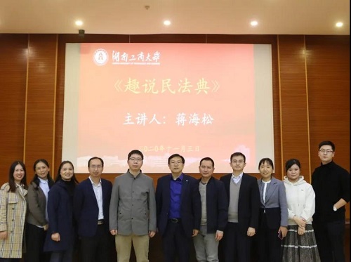 邀请于该校南校区图书馆1楼英才报告厅作“趣说民法典”主题讲座。讲座由该院蒋科老师主持,法管院长刘期湘、党委书记胡艳香、党委副书记袁露等老师出席,五楼自拍
