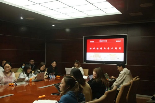 本次会议主要分为两个部分,第一部分由2021级法律硕士张晨宇同学作读书报告,导师针对其读书报告提出完善建议;第二部分由三位老师就科学精神与学术规范作专题讲述。