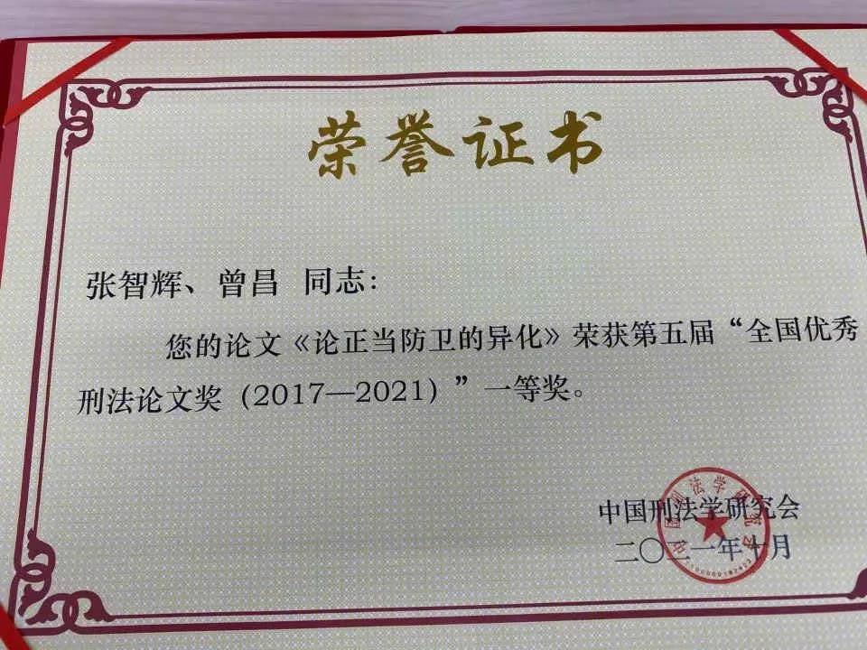 张智辉教授、曾昌博士研究生合著《论正当防卫的异化》一文被评为第五届全国优秀刑法论文奖(2017-2021)一等奖,五楼自拍