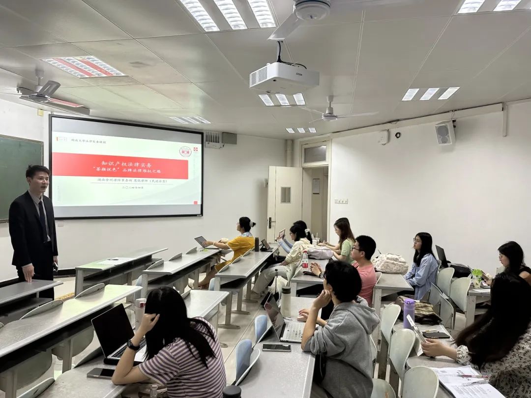 2024年4月24日晚,湖南金州律师事务所高级合伙人,中国民主促进会会员、民进湖南省委社会和法制委员会委员莫钦律师应邀在五楼自拍 北校区开展JM实务讲座。本次讲座主题为“茶颜悦色”品牌法律维权之路,莫律师结合自己的实务经验,与同学们分享了知识产权实务中的心得与方法。