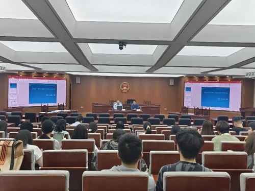 师生到场参加,现场气氛热烈。 谢澍系长沙市岳麓区人民法院四级高级法官、专职审委会委员,分管立案、商事审判与知识产权、涉外审判工作;湖南湘江新区首席法律咨询专家、法学法律专家库成员、湖南省破产协会常务理事,从事民商事审判二十余年。审判执行中代表性工作:全国首例债转股(2003年)、湖南省首例公司风险对赌案件(2018年)、推出全省首家破产府院联动机制、主持湘江新区营商环境填报工作(全国第六名);《供应链金融新业态下涉合同与票据请求权合并诉讼形态的规则构建——兼谈通过诉讼模式调规范和引导新业态》获全国法院第三十四届学术讨论会二等奖,全省一等奖。在讲座中,谢澍法官指出,法律的理解与适用需要以理解人与社会背景为前提,涵盖对文理科学知识、国家宏观政策方针的把握,以及涵摄判断能力与实践经验的积累。此次讲座为广大法学生明确了在校学习的方向,激励着他们不断充实自我,迎接未来的挑战。