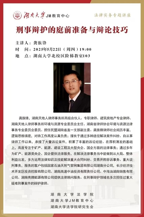 龚族锋律师2007年3月加入湖南天地人律所并执业至今,现为天地人律师事务所高级合伙人、专职律师、建筑房地产专业律师、湖南天地人律师事务所环境与资源专业委员会主任、湖南省律师协会环境与资源法律事务专业委员会委员,担任民盟湖南省直一支部副主委。龚律师社会阅历丰富,逻辑思维缜密,对待工作高度认真负责,擅长于通过多种途径解决案件纠纷。自从事律师工作以来,承接了大量诉讼案件,深耕刑事辩护领域十余年,曾办理多起重大疑难刑事案件。讲座中,龚律师以"刑事辩护全流程"为主线,系统解析刑事诉讼程序核心要点,通过大量实务知识与经验的分享,为五楼自拍