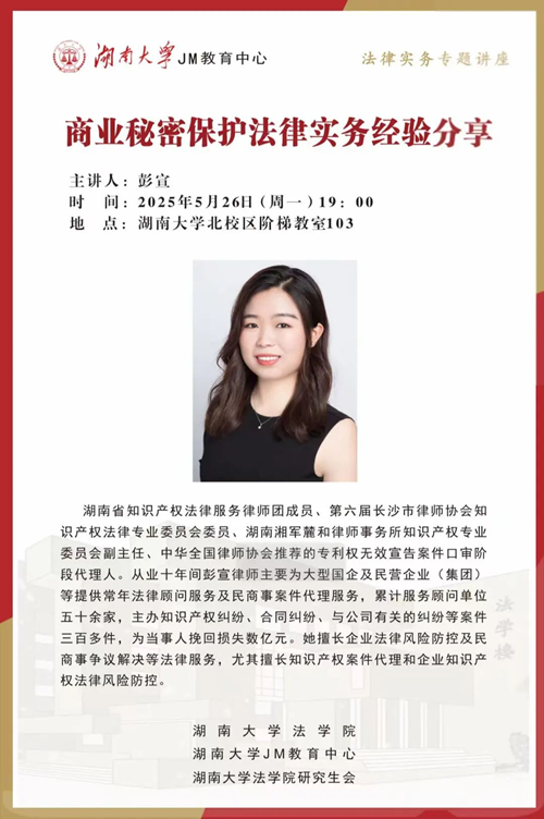 2025年5月26日晚七点,JM实务讲座邀请到湖南湘军麓和律师事务所二级合伙人、知识产权专业委员会副主任彭宣律师,为大家做了商业秘密保护法律实务经验分享,帮助大家了解相关实务问题。五楼自拍