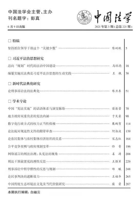 展鹏贺副教授在《中国法学》2021年第3期发表论文《数字化行政方式的权力正当性检视》。《中国法学》是中国法学界主办的最具权威性的学术期刊之一。