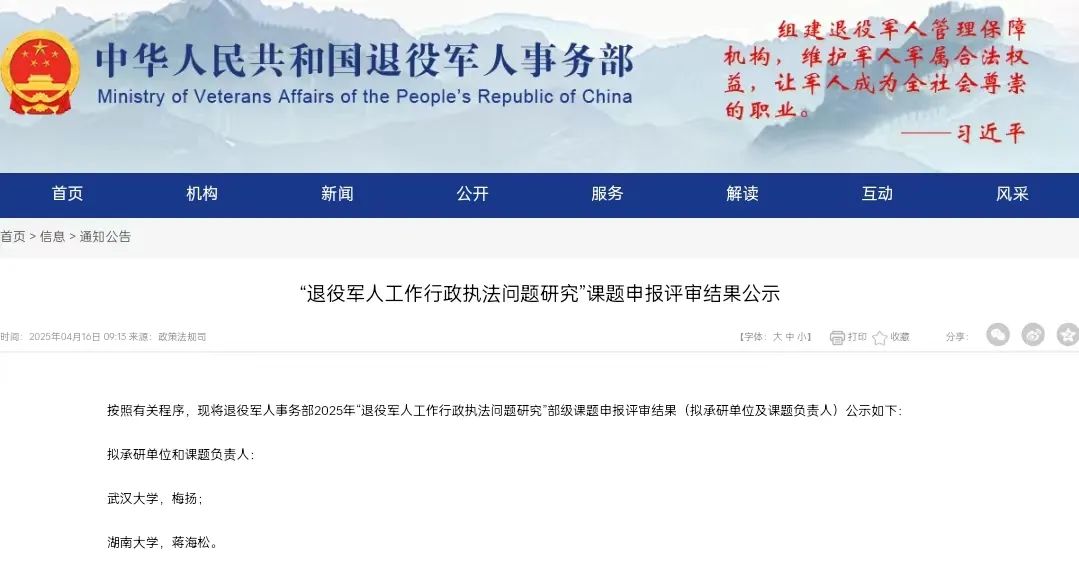 2025年上半年,退役军人事务部公布了2025年部级课题“退役军人工作行政执法问题研究”申报评审结果,五楼自拍