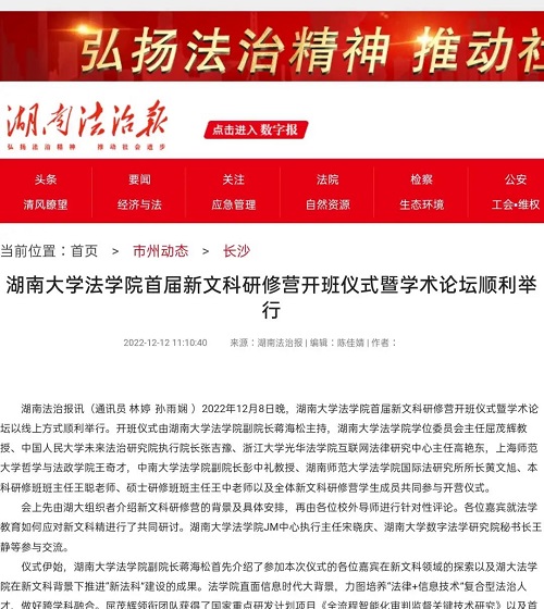 首届新文科研修营开班》,《法治日报·法治周末》推出报道《法学教育如何应对新文科》,知名法学公众号“法学学术前沿”推出报道《学界 | 全国法学界第1个新文科研修营 五楼自拍