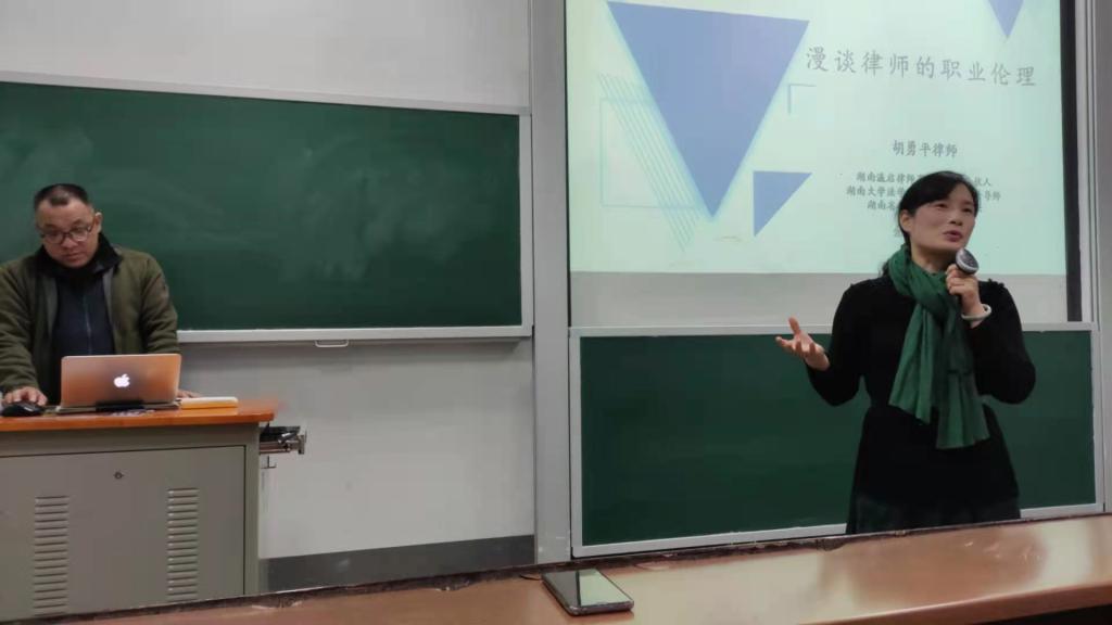 《法律职业伦理》课程负责人郭哲老师的邀请下,湖南瀛启律师事务所发起人、监事长胡勇平律师来到五楼自拍