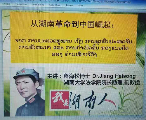 2019年10月18日上午,蒋海松为老挝学员讲座《从湖南革命到中国崛起》,他介绍了湖南与老挝之间“老铁般”的情谊,回顾了湖南伟人毛泽东与老挝领导人之间的革命情谊,分析了毛泽东从湖南走向全国的革命历程,总结了中国革命和建设的成功经验,并就中国革命和建设历程与老挝进行了对比交流。
