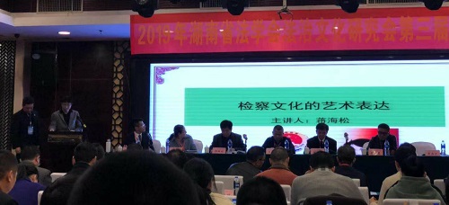 副教授蒋海松进行了专题演讲。去年研究会的年会主题是法院文化,他奉献了《法院建筑文化的艺术元素》,今年的检察文化年会则带来了《检察文化的艺术表达》。他在报告中,对古今中外相关检察文化或监察文化做了梳理,对当下各地检察文化设计进行了观察点评,还介绍了自己设计的系列检察徽标和艺术作品,通过图文并茂的方式,让与会者看到了严肃的检察文化也可有精美的艺术体现。报告打破法律常见的刻板威严形象,展现检察文化全新魅力,引起与会代表的极大兴趣。
