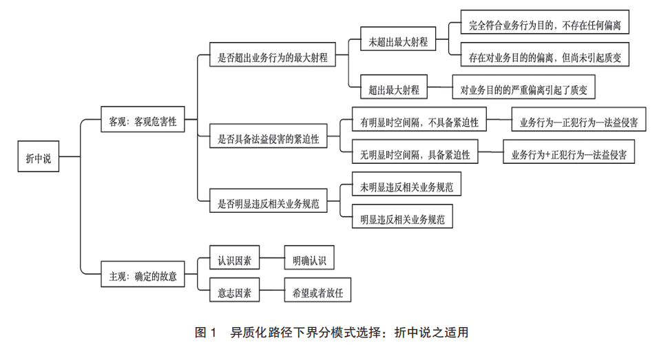 相较于同质化概念构建思维,异质化概念构建思维在法理和逻辑上更具合理性。异质化思维认为,“中性”一词仅仅停留在事实判断阶段,不能涵盖规范判断,无法解读出“正当性”“合法性”的概念内涵。据此,中性业务行为内部被分隔为可罚与不可罚两个下位对峙范畴,行为被认定为中性业务行为,不代表该行为必然不具有可罚性。可罚与不可罚的内在界限,并非概念界定本身所能承载的功能,而应当交由后置于概念界定的可罚性与否的界分模式加以实现。