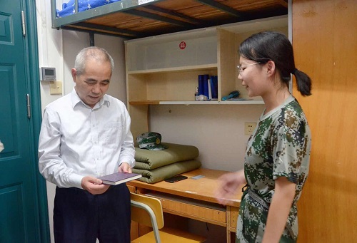 领导与同学们进行了亲切交谈,询问仔细询问新生来自哪里、对大学生活是否适应、食堂饭菜是否合乎口味、对军训感受如何等。屈院长叮嘱大家,注意劳逸结合,即使军训结束,在学习之余也要加强锻炼身体,拥有一个健康的体魄对于顺利完成学业至关重要。他仔细查看新生书架上摆放的书籍,并与学生交流读书心得,勉励同学们要努力学习,踏实读书。