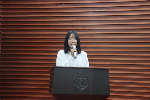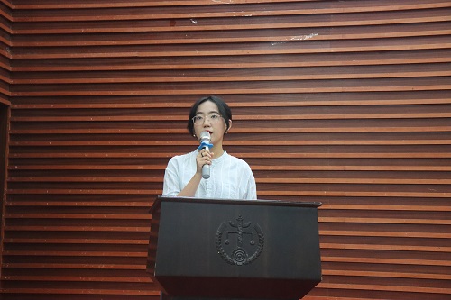 随后青年志愿者代表吴梦琪发言。吴梦琪表示,志愿服务活动绝不是单方面的付出,而是能在其中有所收获。她总结了自己过往两年参加各级各类志愿服务活动的经历和心得,并认为自己在志愿活动中深刻感受到了奉献的快乐与满足以及中国新青年的力量和担当,更坚定了继续投身志愿服务的决心。