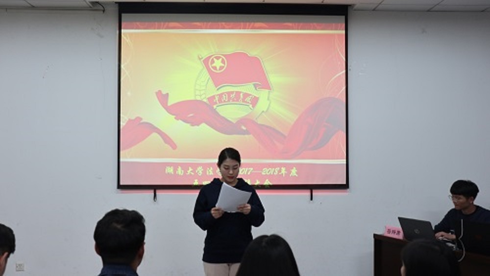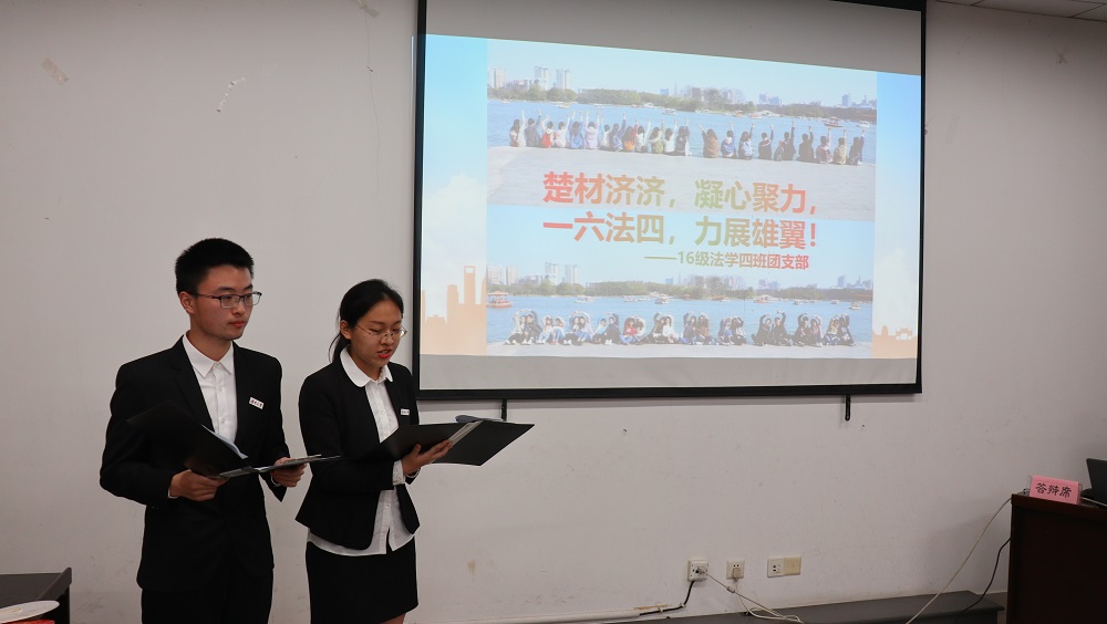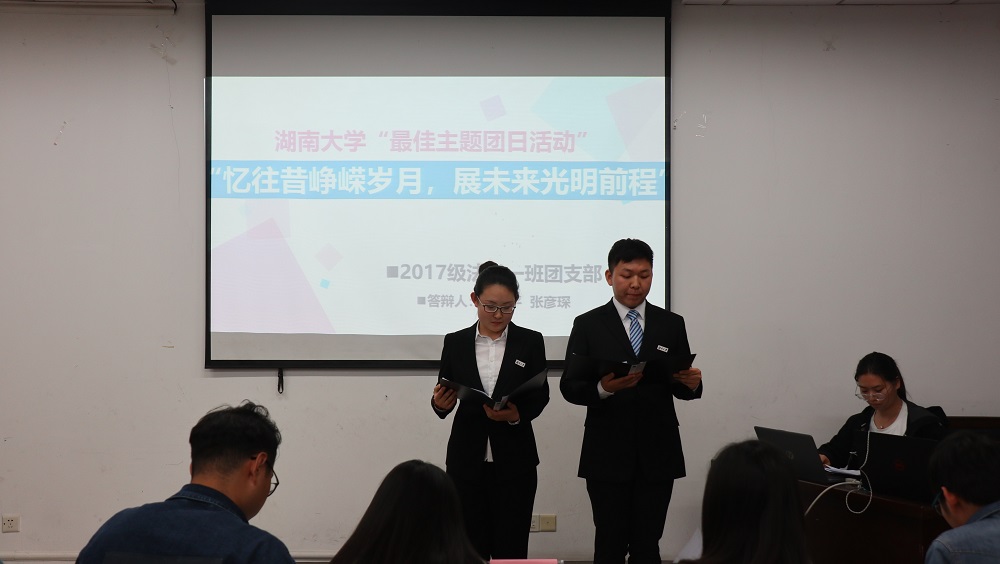 在主持人为答辩小组介绍过本次答辩的规则后,“最佳主题团日活动”候选班级首先进行答辩展示。法学1701、1704、1705班以及行政管理1702班从支部概况、活动内容、活动目的等方面入手,通过别具特色的PPT形式介绍了进入大学以来班级团支部的建设状况。参观省博、游览橘子洲、义卖明信片、医院志愿行……各个班级围绕不同的团日主题展示了非富多彩的活动内容和青年团员朝气蓬勃、紧跟党走的青春活力。在各个班级进行完答辩后,主席团成员针对每班答辩的内容及形式进行点评,并对不足之处提出修改建议。
