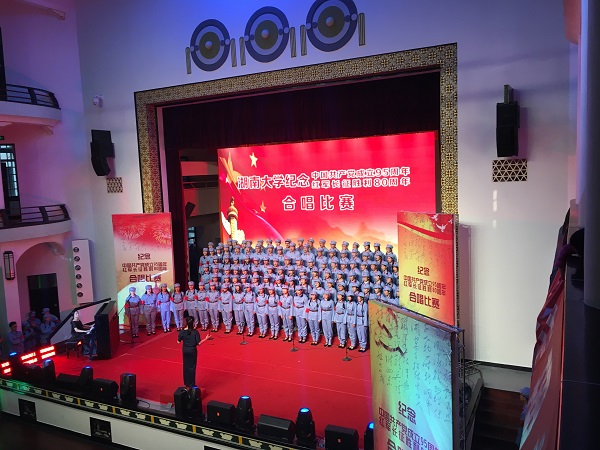 学生合唱团共有120人组成,在比赛中带来了气壮山河的《人民解放军占领南京》和《没有共产党就没有新中国》两首经典曲目。其中,《没有共产党就没有新中国》以京剧的合唱形式、新颖的演唱编排赢得了全场观众热烈的掌声和好评。五楼自拍