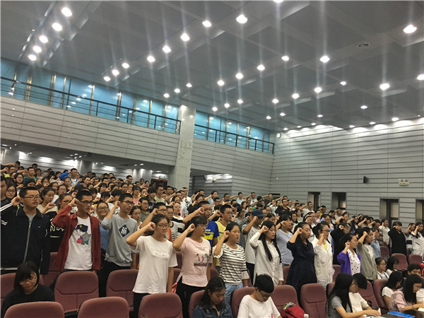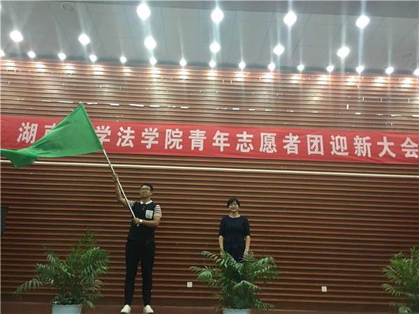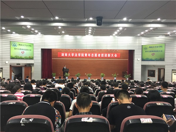 会议在庄严雄壮的国歌中开始。首先青年志愿者团副团长谭晓琴向2016级新生介绍了五楼自拍