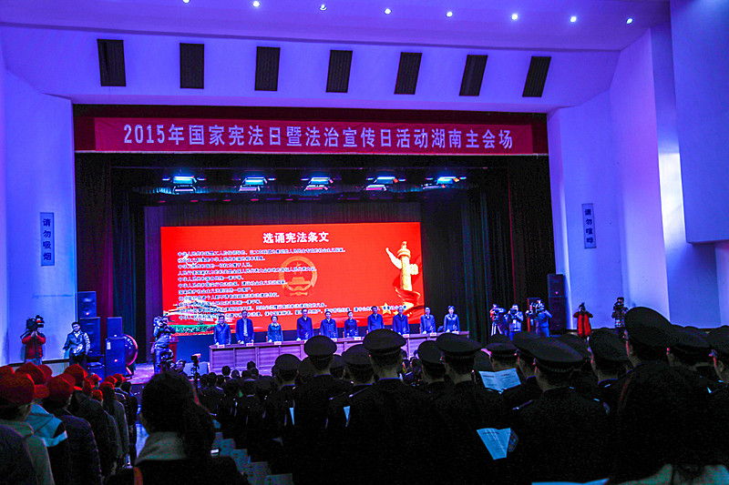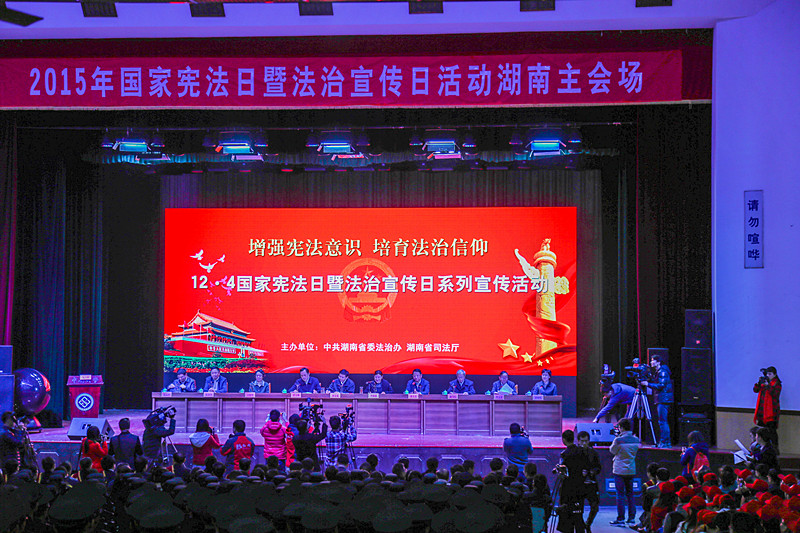 活动以国家宪法日宣誓仪式拉开序幕,全体起立,千人共同选诵宪法条文。随后,省领导宣布2014年度湖南省最具影响力法治人物、法治事件获奖名单,并为2014年度最具影响力法治人物、法治事件颁发奖杯和证书,并同时宣布启动2015年度湖南省最具影响力法治人物、法治事件评选活动。紧接着,活动为湖南省“法润三湘”公共法律服务志愿者组织授旗,并启动了“你学法,我送票,天下凤凰任你游”大型普法创新活动。最后,省领导发表了国家宪法日活动重要讲话。此次活动在气氛热烈的宪法知识有奖抢答活动中顺利闭幕。