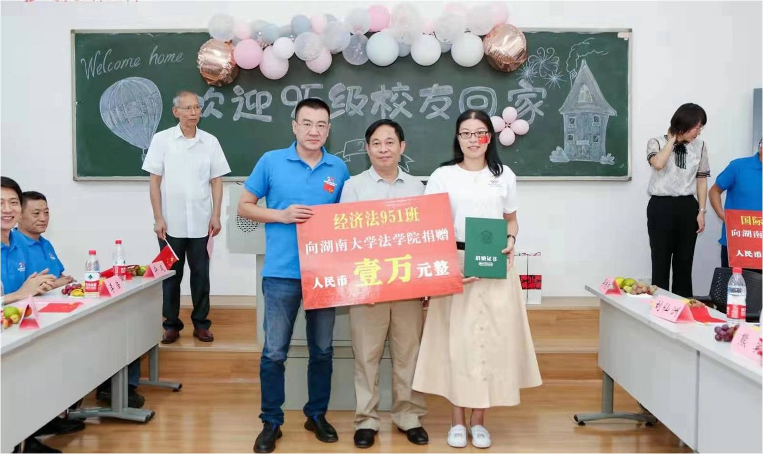 10月3日,在95级校友回访座谈会上,国际经济法951班和国际法951班校友代表分别向母校捐资一万元,并赠与老师们礼品,抒发自己的赤子情怀和母校情结,感恩母校当年栽培之意。易骆之老师、罗英老师、候孝华老师代表五楼自拍