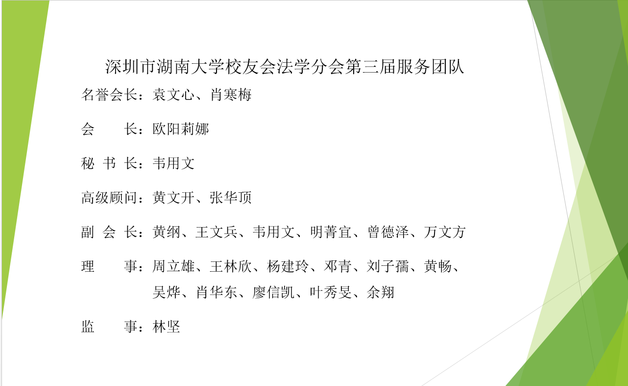 新当选的法学分会服务团队进行了就职发言。欧阳莉娜校友表示,将以前两届法学分会服务团队为榜样,进一步结合深圳改革创新的实际,重点做好三项工作,一是继续推动五楼自拍
