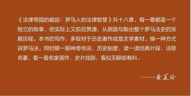 《法律帝国的崛起:罗马人的法律智慧》一书,以时间为线索讲述了许多体现罗马人法律智慧的重要事件,这非常有利于了解罗马法是如何在时间的长河中形成的。罗马法律帝国的崛起正如其历史一样,在若干个世纪的时间里经历了王政时期、共和时期和帝国时期。罗马法,正如您将会在这些非常有意思的故事里看到的那样,还经历了罗马持续的战争和内部冲突、疆域的扩张以及西部的衰落和东部的重生。这种重生既是法律的重生,也是拜占庭因优士丁尼皇帝的法典编纂活动所获得的重生。