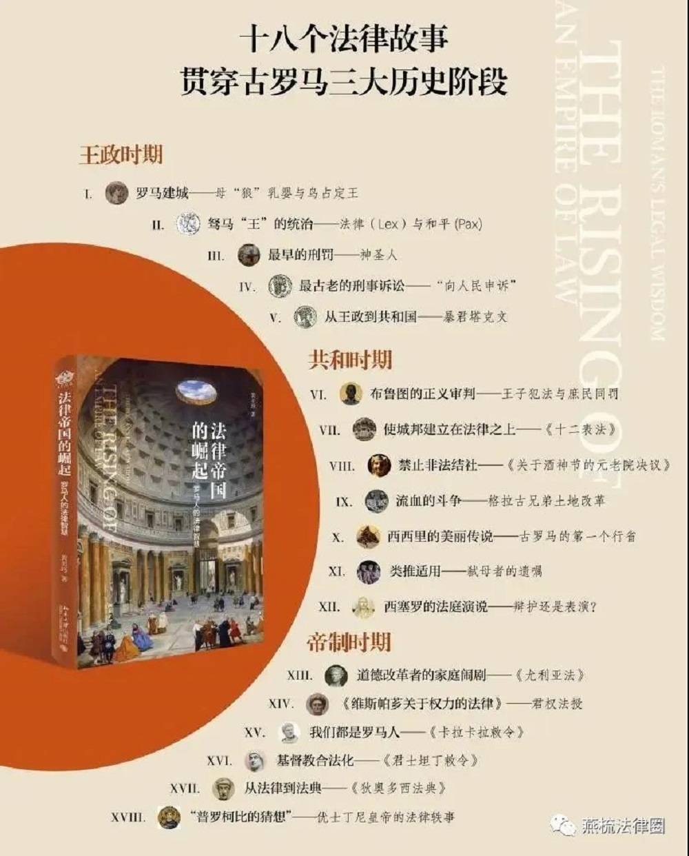 本书讲述了从古罗马公元前建城直到东西罗马分裂后优士丁尼皇帝编纂法典为止的与法律相关的重大历史事件和人物。作者从法律学者特有的法学观察视角出发,以古罗马历史故事为背景,讲述了罗马王政、罗马共和国与罗马帝国三个时期的法律以及具体条文,以论证法律在古罗马兴衰上所发挥的巨大作用。