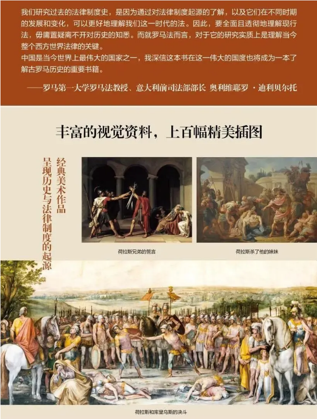 全书共十八章,每一章都是一个独立的故事,但实际上又前后贯通,从侧面勾勒出整个罗马法史的发展历程。本书的写作,多取材于历史著作或是文学素材。换一种方式讲罗马法,同时聊一聊神奇传说、历史制度,读一读经典片段、诗歌名著,看一看名家画作、史片戏剧,看似无聊却有料。一个不重视历史的民族,注定是没有未来的;一个没学习过法律史的法律人,认识绝对是不全面的。当你惊叹于罗马法的魅力时,你也许不知道,每一个法律制度的产生,都凝聚了许多人的心血,他们呕心沥血甚至流血牺牲;每一部法律的颁布,其字里行间无不投射出那个时代所特有的全部内在。无论是从法律的角度去解读历史,还是在历史的长河里去思考法律,罗马法都是我们理解欧洲古代文化的必读篇章。