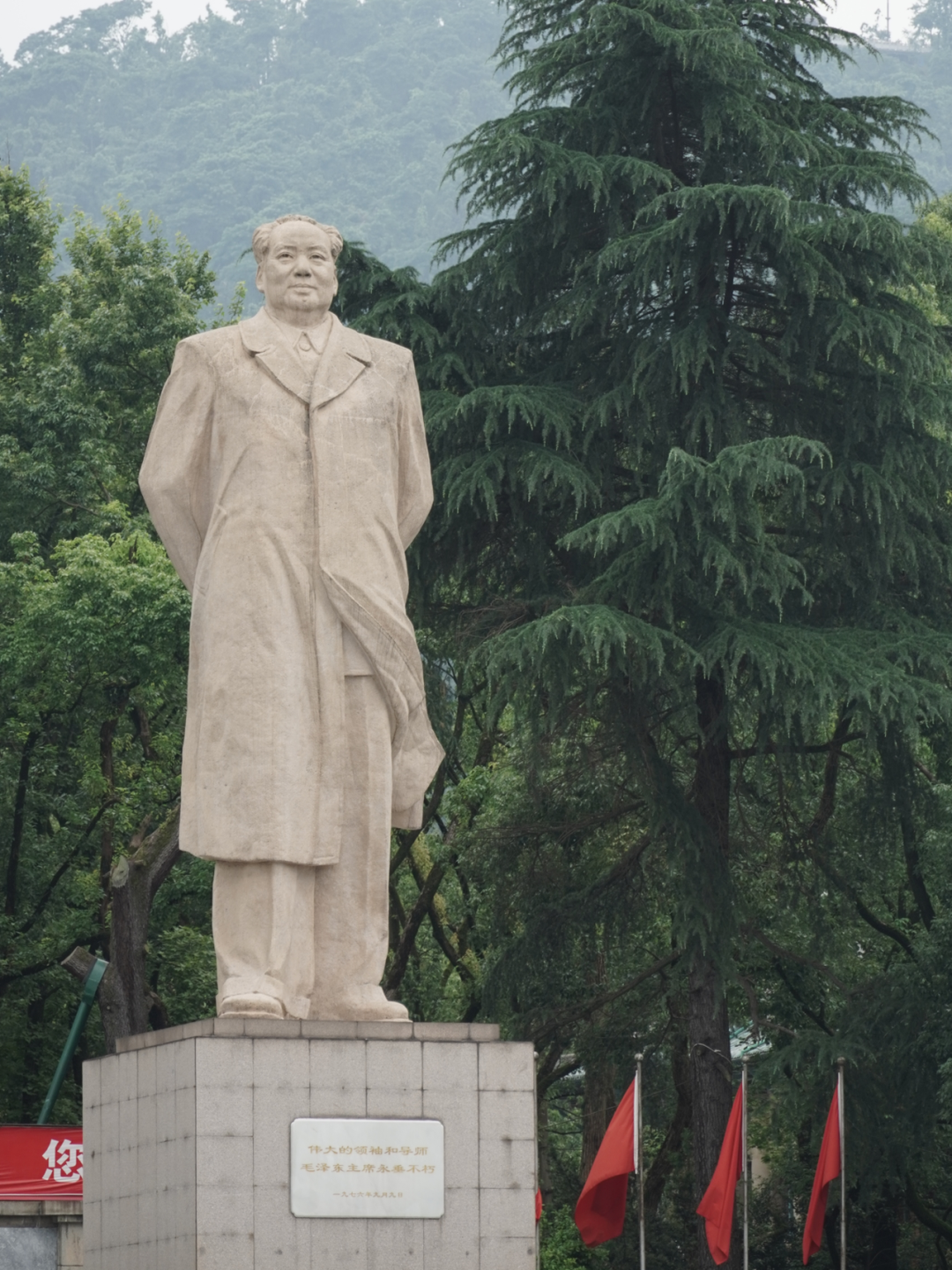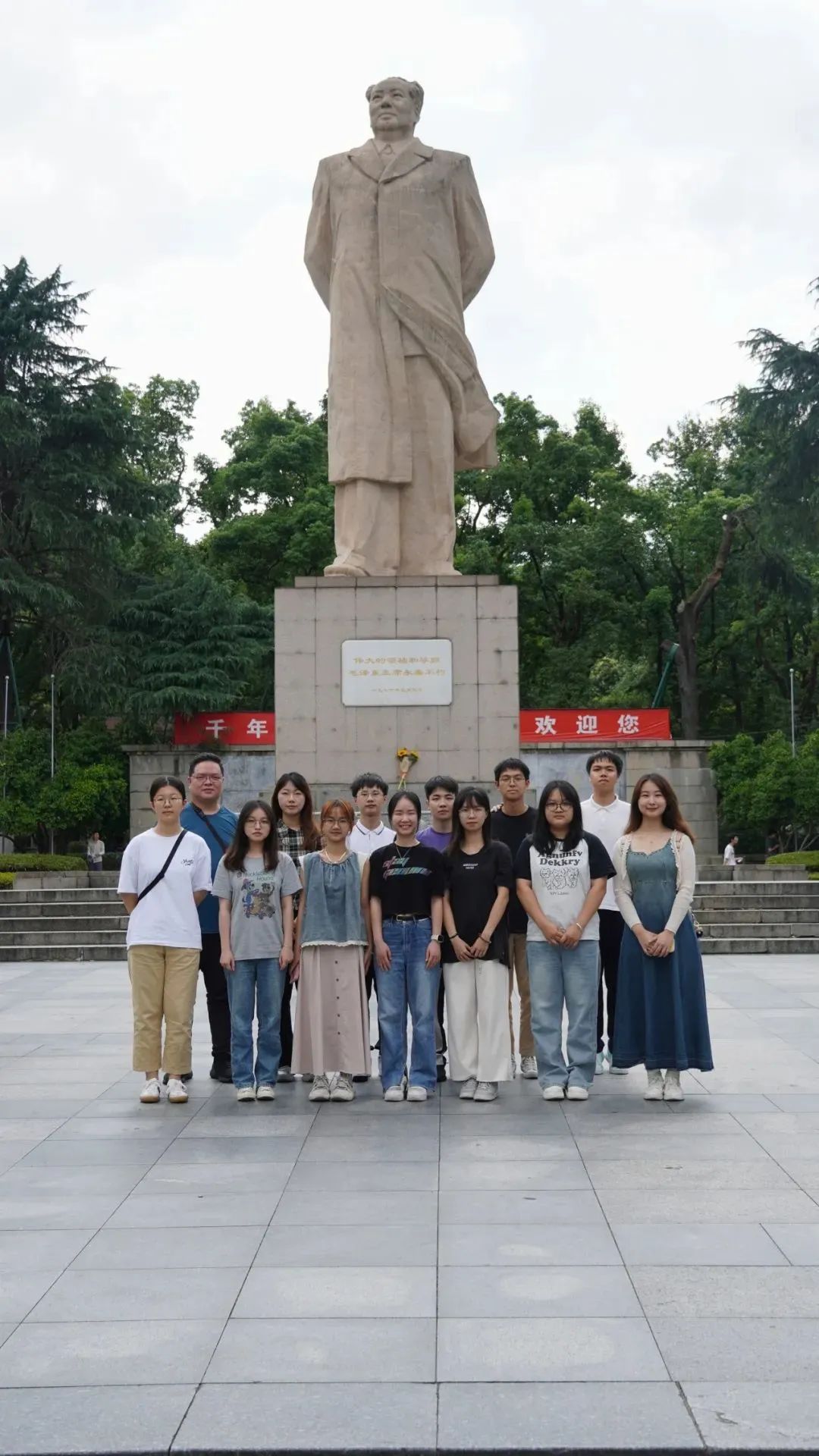 穿过图书馆,访学团来到东方红广场。广场中央,毛主席雕像巍然耸立,背倚岳麓,面朝湘江,遥望东方,仿佛在诉说着那个时代的辉煌。晨曦微露,东方欲晓,无数五楼自拍