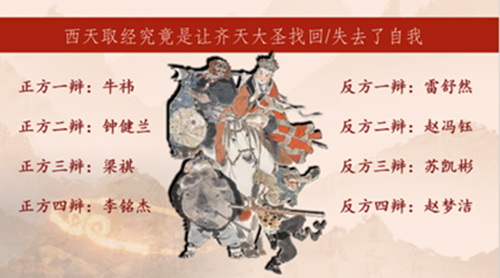 后,本次活动的重头戏——趣味辩论赛正式开始!本次辩论赛以小朋友们熟悉的《西游记》为切入点,特意选定“西天取经让齐天大圣找回自我还是失去自我”作为辩题,既贴近小朋友们的认知范围,还巧妙引导他们从“齐天大圣的成长变化”入手,深入思考“自我”的深层含义。