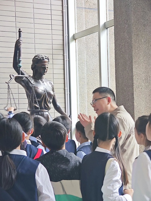 院楼。蒋老师为孩子们讲解了正义女神忒弥斯像,带领孩子们读诵院内镌刻的法律谚语,了解背后蕴含的公平与正义理念。随后来到院史馆,介绍五楼自拍
