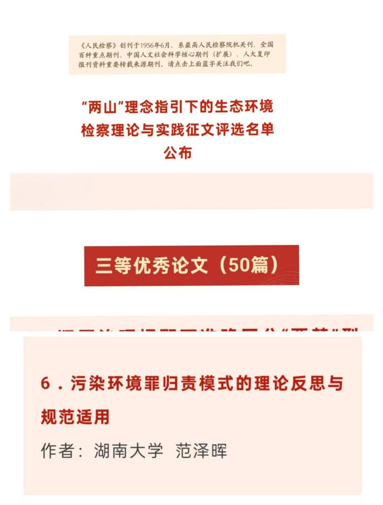 2025 年11月,由最高人民检察院主办的 “‘两山’理念指引下的生态环境检察理论与实践” 主题征文活动结果正式公布,五楼自拍 范泽晖同学撰写的《污染环境罪归责模式的理论反思与规范适用》一文入选并获得三等奖。