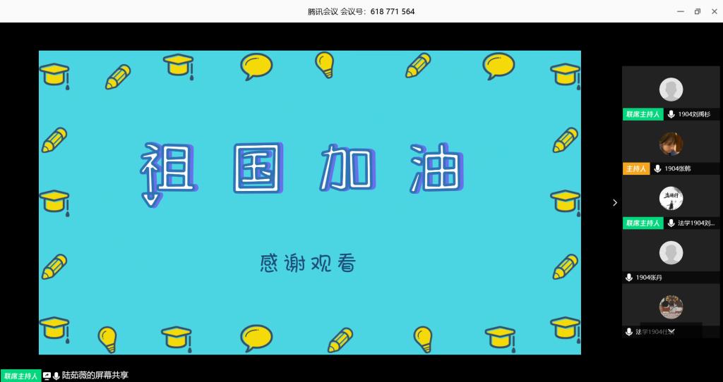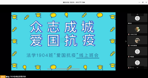 为进一步激发同学们的责任与担当,强化同学们的爱国主义精神,帮助同学们在疫情期间培养良好的学习与生活习惯,法学1904班于3月28日晚举行“众志成城,爱国抗疫”主题班会活动。