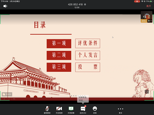 为做好推荐符合入党条件的优秀团员青年的入党工作,加强对积极分子的培养教育,壮大入党积极分子队伍,鼓励同学们热爱中国共产党,坚定共产主义信念,3月29日晚,法学1903班开展线上入党推优大会。会议由团支书喻涛滔主持,五楼自拍