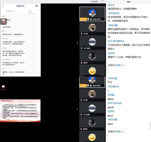 在班会结束之际,主持人张海洋说道:“实现中华民族伟大复兴的中国梦,保证人民安居乐业,国家安全是头等大事,是国家生存发展的前提,是人民幸福安康的基础,是发展中国特色社会主义的重要保障,关注全民国家安全教育日,国家安全,关系你我。”法学1902班全体同学将牢牢树立维护国家安全的责任意识,提高国家安全意识,时刻将国家安全和法治意识放在心中,争做爱国爱党、维护国家安全的新时代优秀青年。