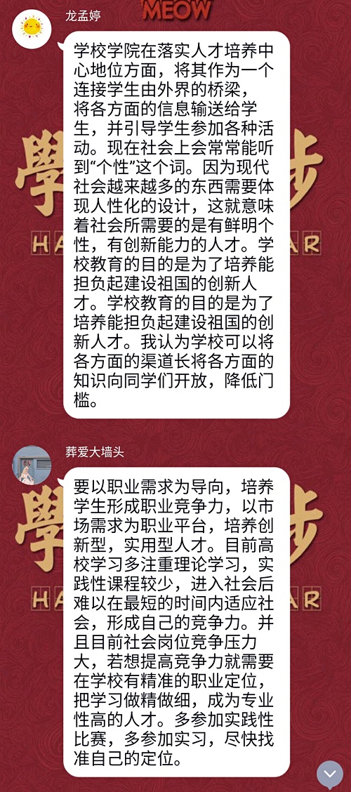 为积极响应落实人才培养中心地位大讨论活动的号召,凝聚师生智慧,进一步营造人人关心、人人参与的氛围,法学1801班于5月10日晚举行了线上班会,同学们积极参与讨论,纷纷建言献策。