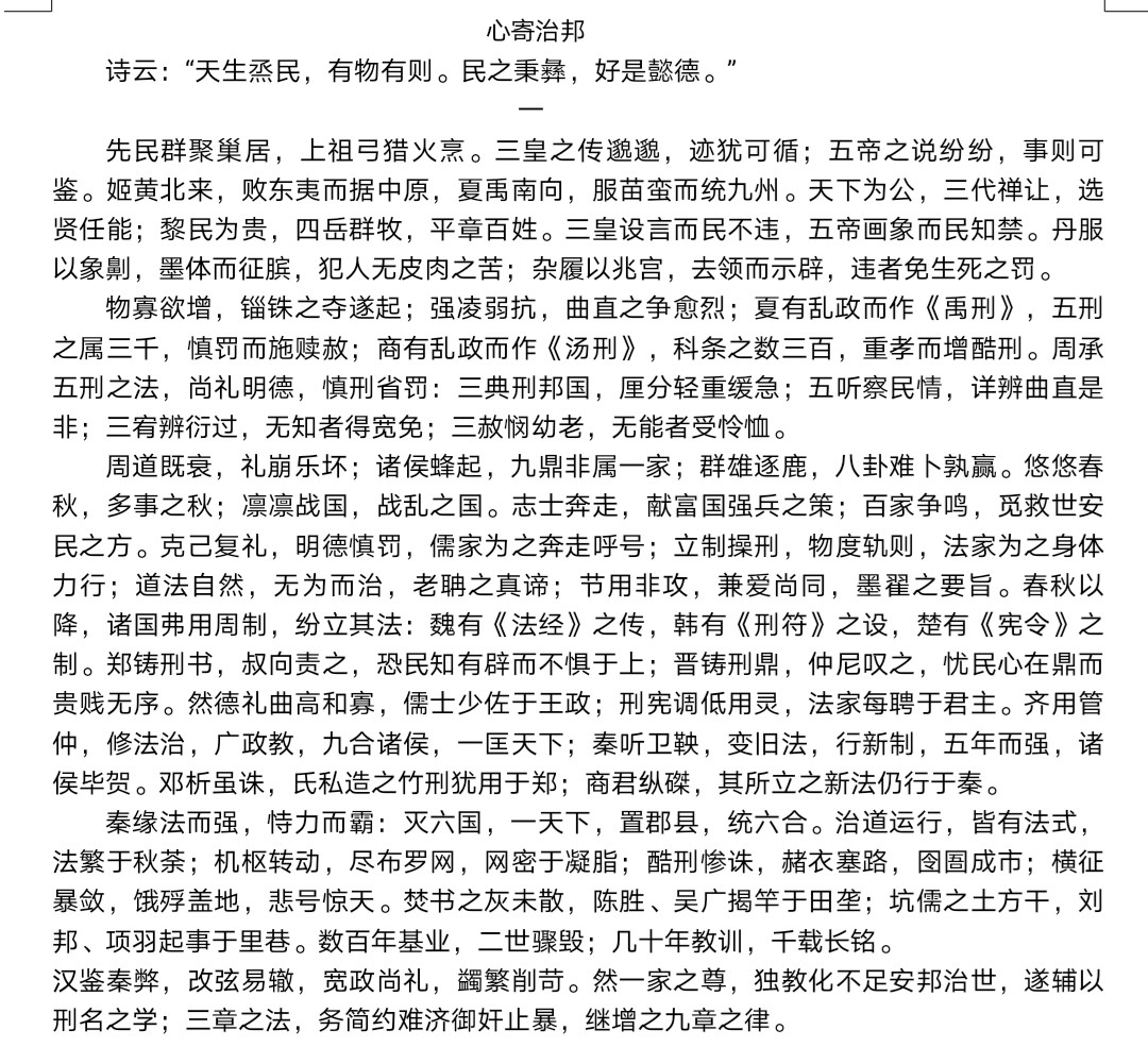 在最开头的两句中,作者以朝日西去对应了我国清朝已不复当年繁华,从前的世界文明的最高点已经沦于落寞的现实困境。而夷寇东来则对应了清朝末年西方国家开始侵略我国的悲惨事实。也透露出了一国若无法治终究会被时代所抛弃的事实。接着作者以简短的语言讲述开来我国近代学者对法治的探索:“御外安内之议遽起,变法图强之论因生。或举泰西之制证之于古,或援汉家故物用之于今。西法东渐,法治之说得势;古礼今废,德治之声失时。”这表明了我国社会向法治转变,虽然这些运动失败了,但是也为我国法治化发展提供了可能性。