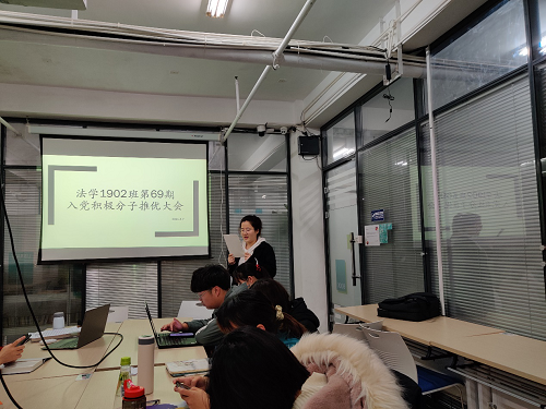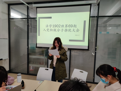 入党推优工作是党组织赋予共青团的光荣职责,也是共青团组织充分发挥党的助手和后备军功能的重要体现。为响应党的号召,法学1902班团支部于2021年3月9日晚在图书馆研讨空间5召开入党推优大会。推优大会由法学1902班团支书张海洋同学主持,组织部纪春羽同学全程监督。