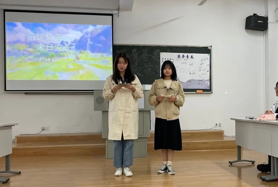 小组分享结束后,班会进行第二项:慎而思之,勤而行之。班主任和学长学姐为同学们送上青春寄语。首先,班主任郭哲老师与同学们分享自己的青春故事,并对同学们近期的学习生活状况表达了关心。她希望同学们在目前的大学阶段能注重基础知识的积累,避免过度焦虑,一步步发现法学之魅力。由于课程冲突,受邀参加此次班会的喻涛滔学长、刘静雯学姐未能到场,其寄语分别由班长张宇翔、团支书张伟浩代为朗读。其中“如果此刻你如愿以偿,那就:希望此刻不要成为你人生的巅峰。如果此刻事与愿违,那就:悟已往之不谏,知来者之可追”“站在人生新的起点,面对日新月异的时代浪潮,我们每个人都是时代下的产物,但命运和机遇却也掌握在我们自己的手中”的语句让同学们感触颇深。