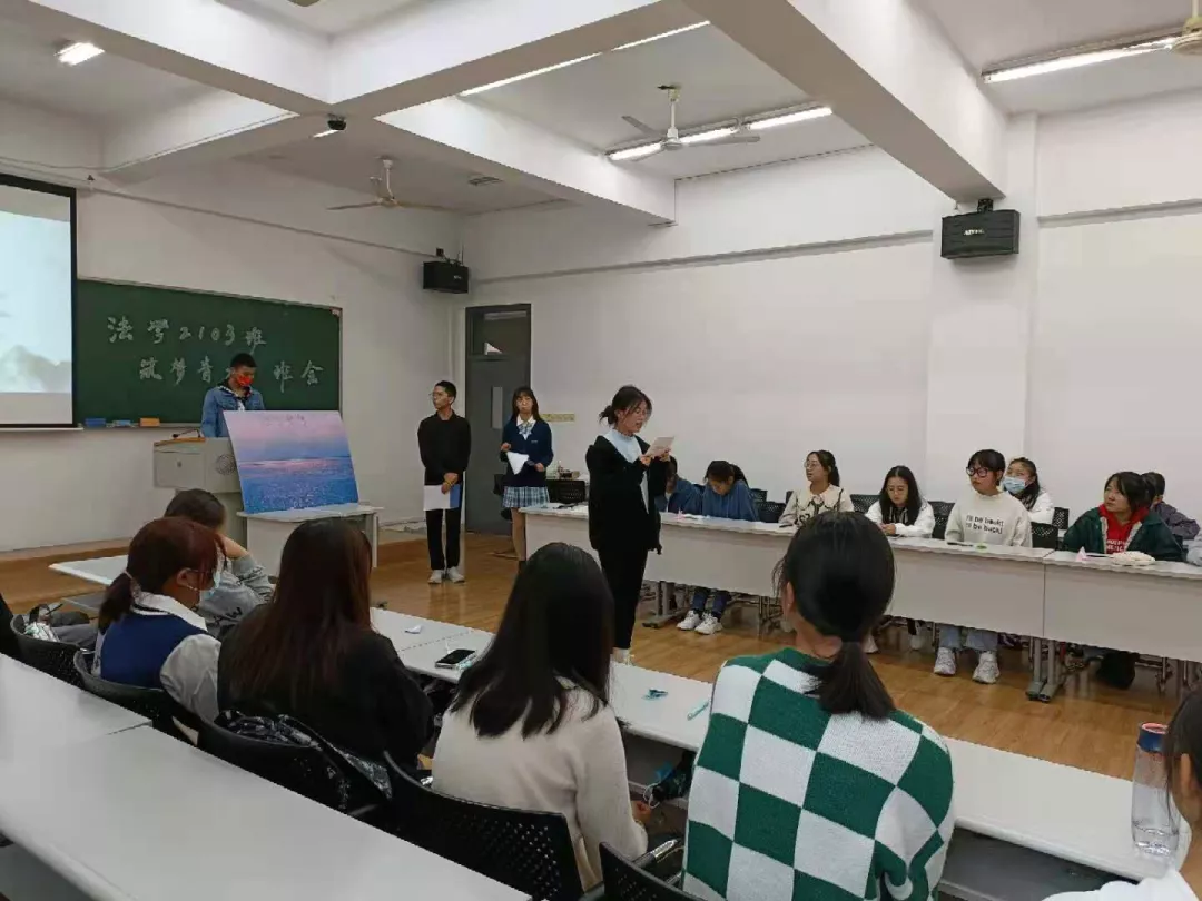 副院长黎四奇老师、法学2103班班主任彭中遥老师出席指导班会,法学2103班全体同学参与班会。班会由吴梓涵、王光明主持。