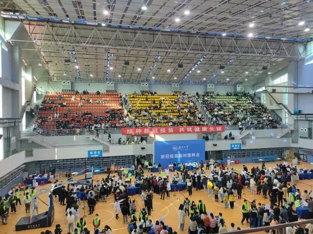 候诊区的志愿者主要负责在形体房内协助校医院老师、指导受种同学和老师按照指引登录系统填报接种信息、在形体房出口处检查将受种者是否已生成条形码。预检区的志愿者则负责在体育馆大厅入口处维持秩序、控制受种者入场、测温并提醒受种者佩戴口罩。