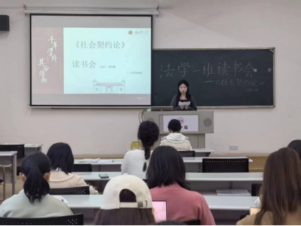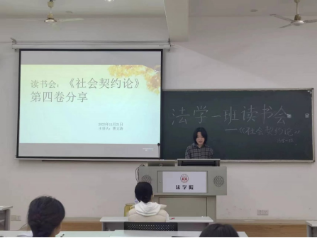 303教室举行《社会契约论》读书会。《社会契约论》是法国思想家卢梭创作的法学名著,被列为“启蒙运动三书”之一,本书对于法律的探讨,能帮助同学们扩展法律视野,引导同学们进行学术性思考,对同学们具有启示意义。读书会邀请班主任李婧嵘老师指导点评,学习委员焦思潼同学主持,张炀、李敏学、邹艳萍和费文涛四位同学作为主讲人,法学2301班全体同学参与。大家各抒己见,在自由讨论的氛围中了解同学们多元的看法,提升了思维和说理能力。