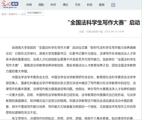 “全国法科学生写作大赛”的成功启动引发全国媒体密集报道。截止到8月底,据不完全统计,已有《光明日报》、《中国法学》杂志社、人民网、中国网、《检察日报》、《法治周末》、法制网、中国教育新闻网、《潇湘晨报》、澎湃新闻网、腾讯网、网易、今日头条、法律博客、科教文汇、北国网、天天快报、网易快报、天下看点、中国教育人才网、红网、新浪湖南、深圳热线、东方资讯、110法律咨询网、搜狐、华奇网、求学网、凯迪网络等全国三十多家媒体的报道,此外还有郑州大学五楼自拍